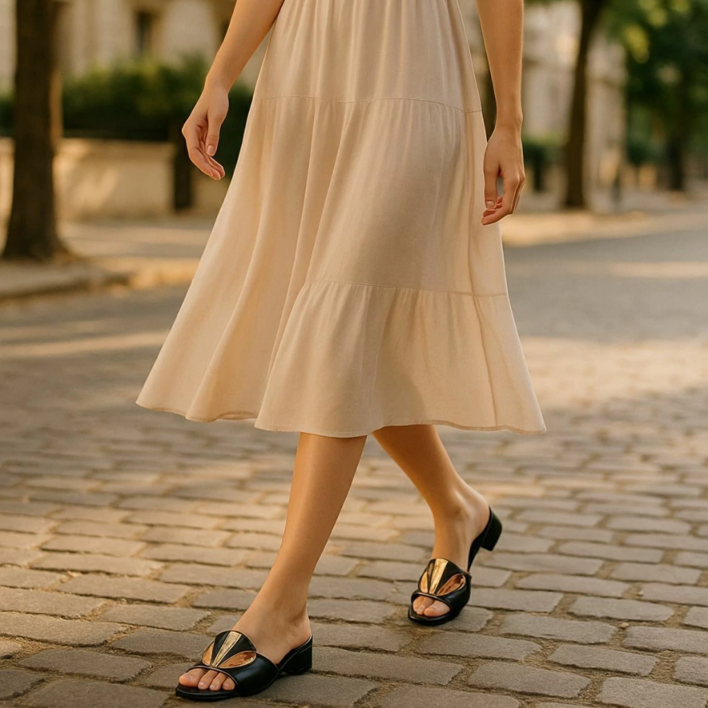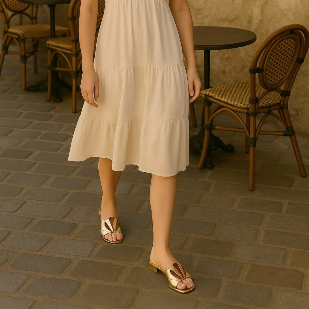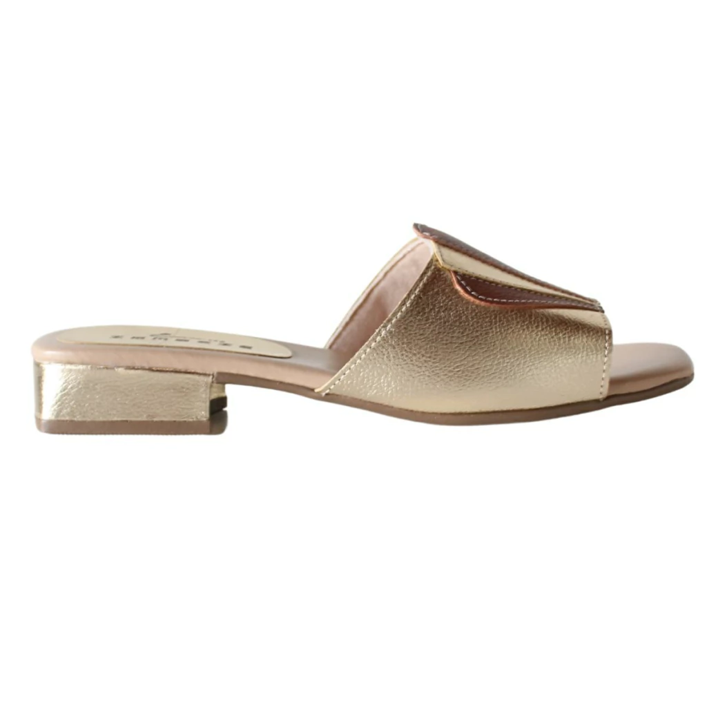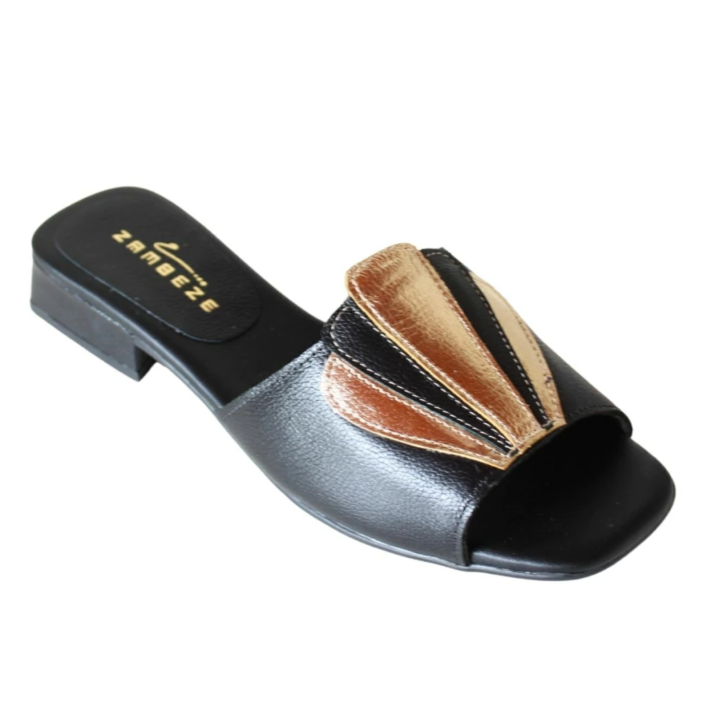 Essa sandália da Zambeze é uma joia do estilo retrô Boho com toque moderno. Com design inspirado no art déco, ela se destaca pela aplicação em formato de leque sobre o cabedal, feita com recortes em couro metalizado e tons contrastantes que valorizam o visual. A base é estruturada com palmilha macia e salto baixo quadrado, oferecendo conforto e estabilidade para o uso diário.
