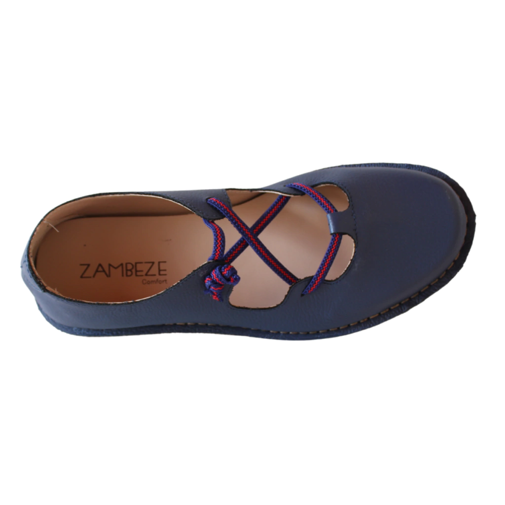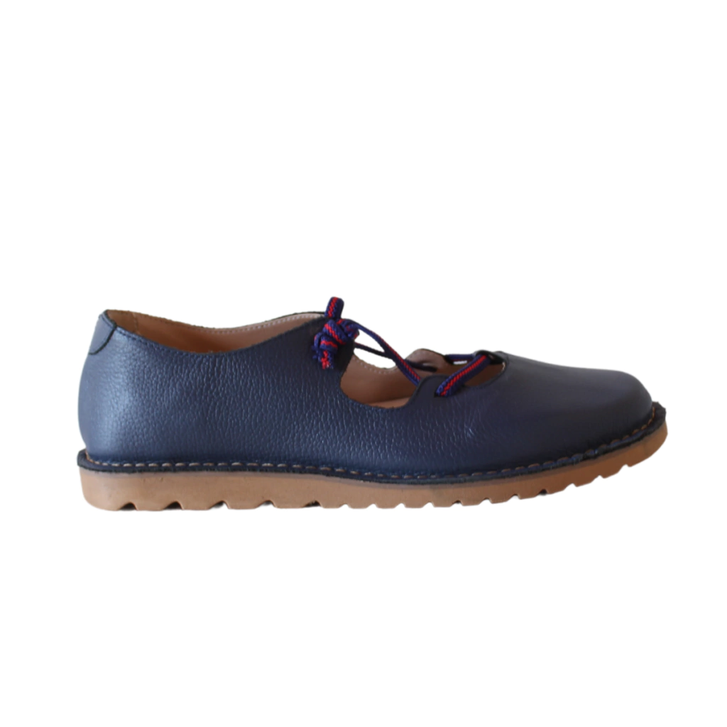A silhueta do sapato se destaca pelo seu estilo casual com detalhes em cadarço azul e vermelho que contrastam elegantemente com o couro azul. A sola de borracha baixa, com apenas 1 cm de altura, proporciona uma caminhada confortável sem desigualdade de altura entre o calcanhar e a frente, mantendo a estabilidade. A sola é projetada para aderir bem a diferentes superfícies, prevenindo deslizes e garantindo segurança em cada passo.