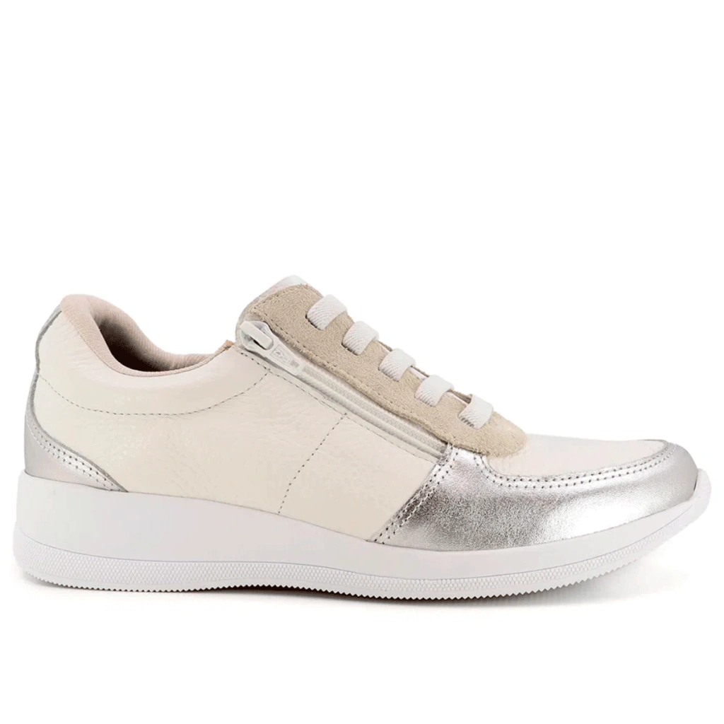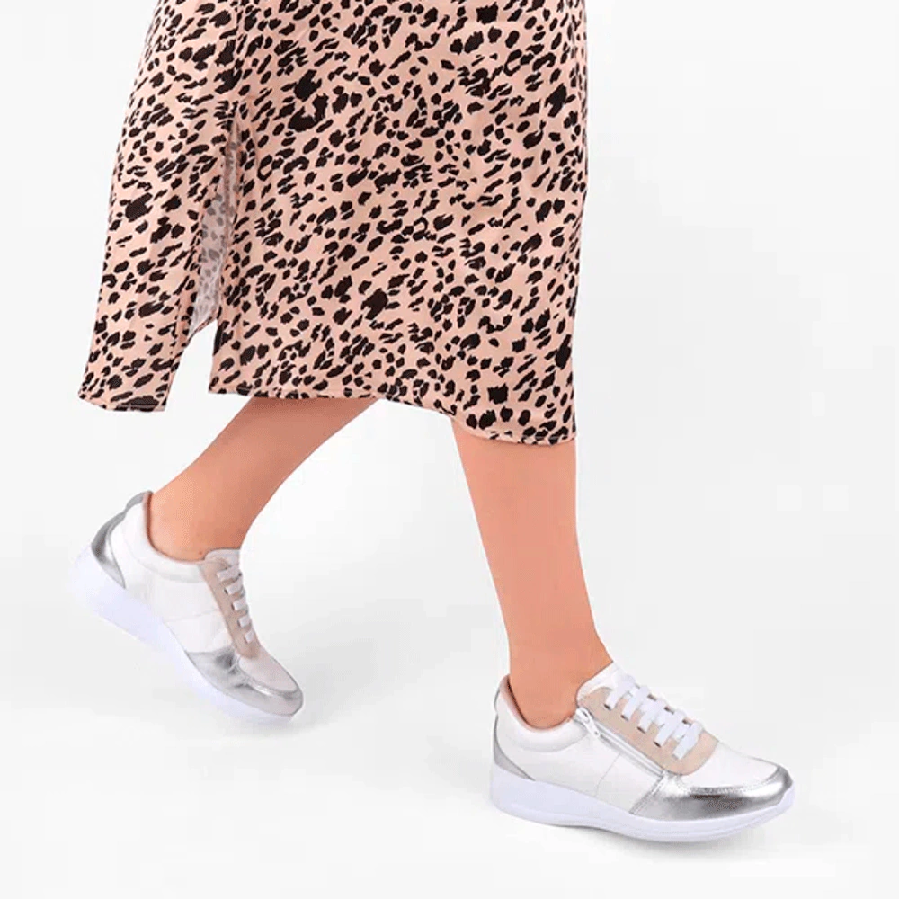 Este tênis prateado da Usaflex é uma escolha ideal para profissionais da área de saúde e estética, projetado especificamente para suportar longas jornadas de trabalho. Fabricado com couro de alta qualidade e revestido internamente com tecido espumado, oferece um conforto sem igual. O design inclui um bico redondo que proporciona espaço adicional, reduzindo a pressão nos dedos e agravamentos em condições como joanetes e neuromas de Morton.